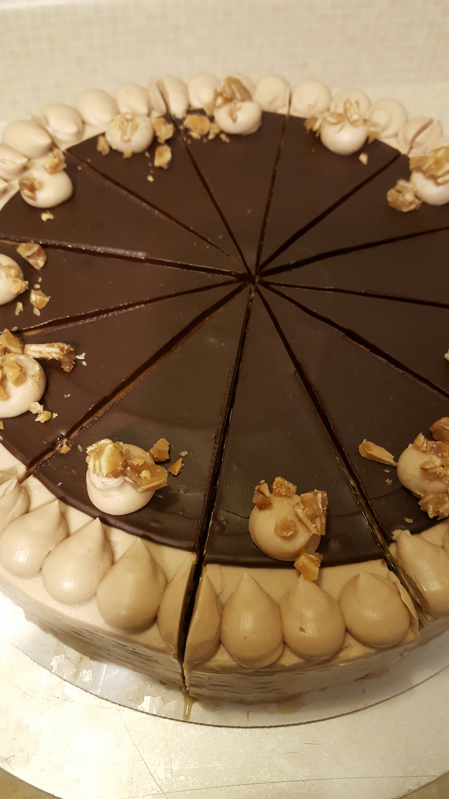 Symphony Torte Chocolate sour cream layers filled with milk chocolate almond praline bavarian creme ..Flat iced with milk chocolate buttercream, rosettes topped with chunks of almond praline.. Share this: Click to share on X (Opens in new window) X Click to share on Facebook (Opens in new window) Facebook Like Loading...